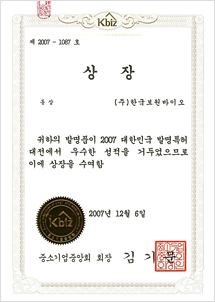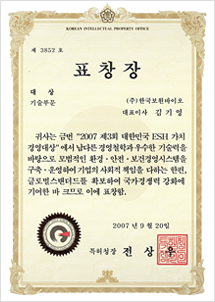 2007 ESH Value-Management Grand prize by Commissioner of the Korean Intellectual Property Office Award certificate
